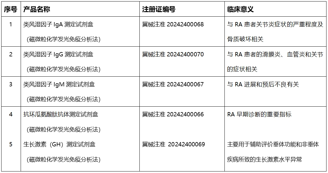 Àà·çʪÒò×Ó·ÖÐÍ£¨RF-IgA¡¢RF-IgG¡¢RF-IgM£©¡¢CCP¿¹Ìå¡¢Éú³¤¼¤ËØ£¨GH£©¡¢ÒȵºËØÑùÉú³¤Òò×Ó½áºÏÂѰ×-3£¨IGFBP-3£©¼ì²â¾ù½ÓÄÉ»¯Ñ§·¢¹â·¨£¬Í¬Ê±ÊÊÅäMQ60ϵÁе¥ÈË·Ý»¯Ñ§·¢¹âÃâÒß·ÖÎöÒÇÒÔ¼°CϵÁÐÈ«×Ô¶¯»¯Ñ§·¢¹âÃâÒß·ÖÎöÒÇ¡£¸ÃϵÁÐÏîÄ¿µÄÉÏÊУ¬½«½øÒ»²½¸»ºñ¹«Ë¾»¯Ñ§·¢¹âÕï¶Ï²úÎïµÄÖÖÀ࣬Ŀǰ¿É¼ì²âµÄÏîÄ¿Àۼƽü°ÙÏ