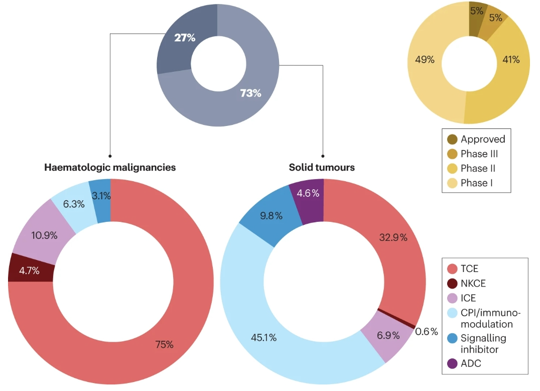 目前,有300多项临床试验涉及200多种差异的双特异性抗体分子,其中约75%用于治疗实体瘤,25%用于治疗血液系统恶性肿瘤。有10种bsAb药物已被批准用于癌症治疗,其中9种在美国和/或欧洲获得批准,cadonilimab在中国获得批准。到目前为止,临床中开发的很大一部门bsAbs已经处于后期阶段(II期和III期)。另外,可以发现,治疗实体瘤的bsAbs主要由免疫调治剂主导,包罗双CPI(约45%)和TCE(约33%),其次是靶向双途径、ICEs和ADC的bsAb。