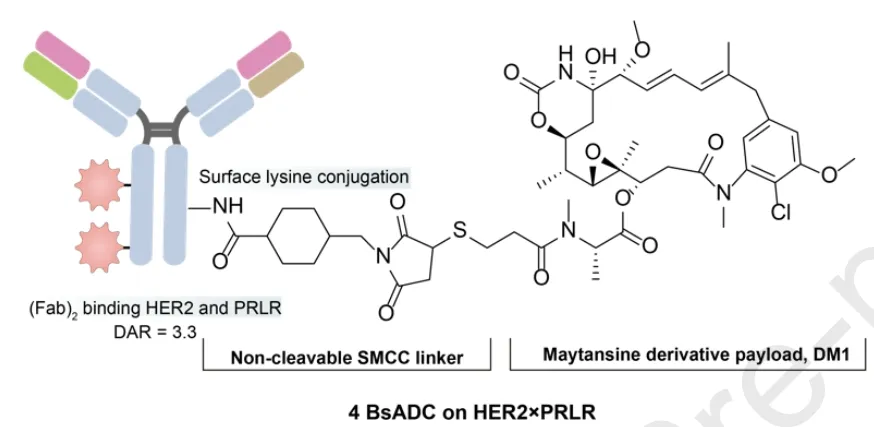 ½ÓÄÉ"Knobs-into-Holes"£¨KIH£©¼¼Êõ£¬Éè¼ÆÁËÒ»ÖÖº¬ÓÐHER2ÌØÒì±ÛºÍPRLRÌØÒì±ÛµÄË«ÌØÒìÐÔ¿¹Ì壨Bispecific Antibody, BsAb£©¡£ÕâÖÖBsADCͨ¹ýÔÚÆäÍâòÀµ°±ËáÉÏÒýÈë²»ÐÐÁѽâµÄÁ¬½Ó×Ó£¨ÈçN-succinimidyl 4-(maleimidomethyl)cyclohexane-1-carboxylate, SMCC£©£¬½«DM1£¨Ò»ÖÖ¿¹ÓÐË¿ÆÆÁÑÒ©ÎÓ뿹ÌåÁ¬½ÓÆðÀ´£¬ÐÎ³ÉÆ½¾ùÒ©ÎÌå±ÈÂÊ£¨DAR£©Îª3.324µÄBsADC¡£Ñо¿½²Ã÷£¬×ÝÈ»PRLRÔÚϸ°ûÍâòµÄ±í´ïˮƽµÍÓÚHER2£¬Ò²×ãÒÔÒý·¢Á¬ÐøµÄÄÚ»¯×÷ÓúÍËæºóµÄÈÜøÌå½µ½âÀú³Ì¡£Õâ½²Ã÷¸ßÖÜתÂʵÄÍâò°Ð±ê£¬¼´±ã±í´ïˮƽ²»¸ß£¬Ò²ÄÜÓÐЧµØ´Ù½øÄÚ»¯ºÍÈÜøÌå½µ½â£¬´Ó¶ø¿ÉÄÜÌá¸ßBsADCsµÄÁÆÐ§¡£