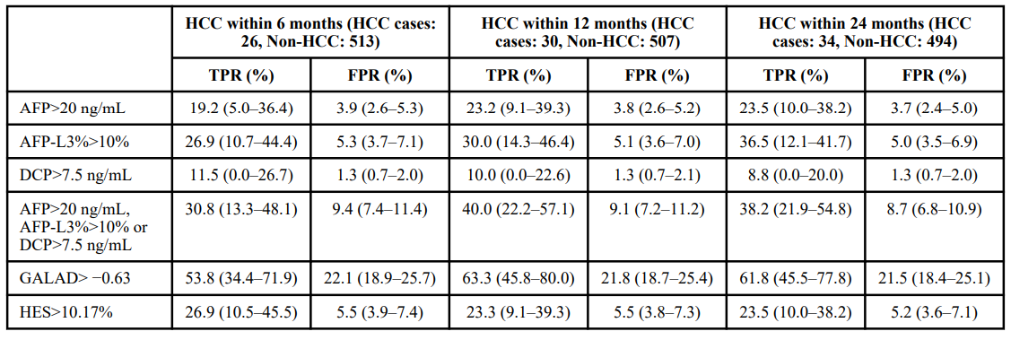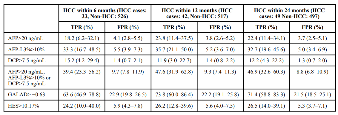 参考文献:Tayob N, Kanwal F, Alsarraj A, et al. The performance of AFP, AFP-3, DCP as biomarkers for detection of hepatocellular carcinoma (HCC): a phase 3 biomarker study in the United States[J]. Clinical Gastroenterology and Hepatology, 2023, 21(2): 415-423. e4.