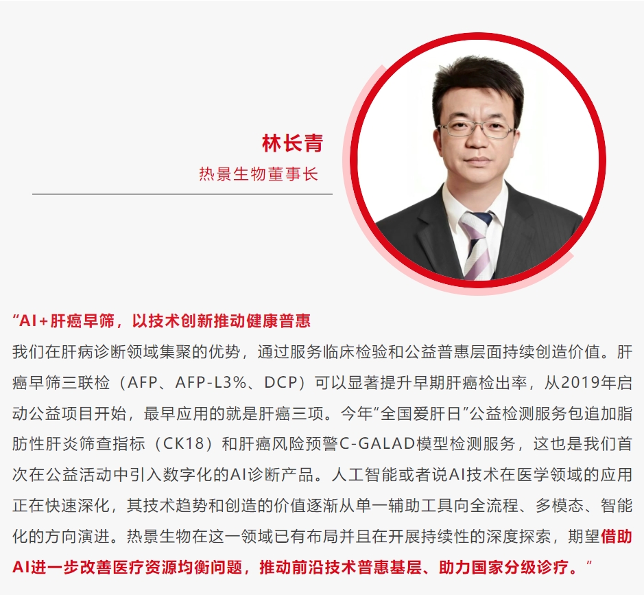 3月18日,值第25个“全国爱肝日”期间,“2025肝癌防治康健中国行——全国爱肝日”大型公益义诊运动在全国30省份近百家医院的协同下联合展开,惠及近万人次,公益康健服务包(肝癌三项、GP73、CK18-M30/M65等)由q千亿球友会支持。2025年升级版“肝病全周期康健检测服务包”首次融合数智化AI诊断模型,探索“AI+创新诊疗”公益新模式,通过智能算法提升肝癌筛查效益,助力实现"筛查-诊断-干预"全流程精准治理,全面推动肝癌防治迈入数智化新阶段。
