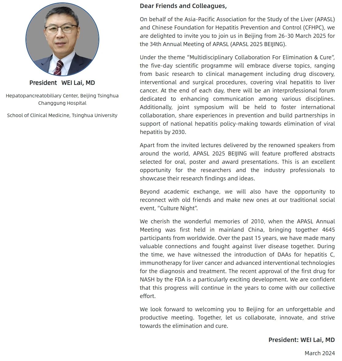 µÚ34½ìÑÇÌ«¸Î²¡Ñ§»áÄê»á£¨APASL 2025£©½«ÓÚ2025Äê3ÔÂ26-30ÈÕÔÚ±±¾©¹ú¼Ò¾Û»á»áÒéÖÐÐÄÂ¡ÖØ¾ÙÐС£´ó»áÒÔ"¶àѧ¿ÆÐ×÷£º¸Î²¡Ïû³ýÓëÖÎÓú"£¨Multidisciplinary Collaboration For Elimination & Cure£©ÎªÖ÷Ì⣬ÓÉÇ廪´óѧÁ¥Êô±±¾©Ç廪³¤¸ýҽԺκÀ´½ÌÊÚµ£ÈÎÖ÷ϯ£¬½«»ã¾ÛÈ«Çò¸Î²¡Ñ§¶¥¼âר¼Ò£¬ÅäºÏ¹¹½¨¿çѧ¿ÆÐ×÷µÄ´´Ð·¶Ê½¡£