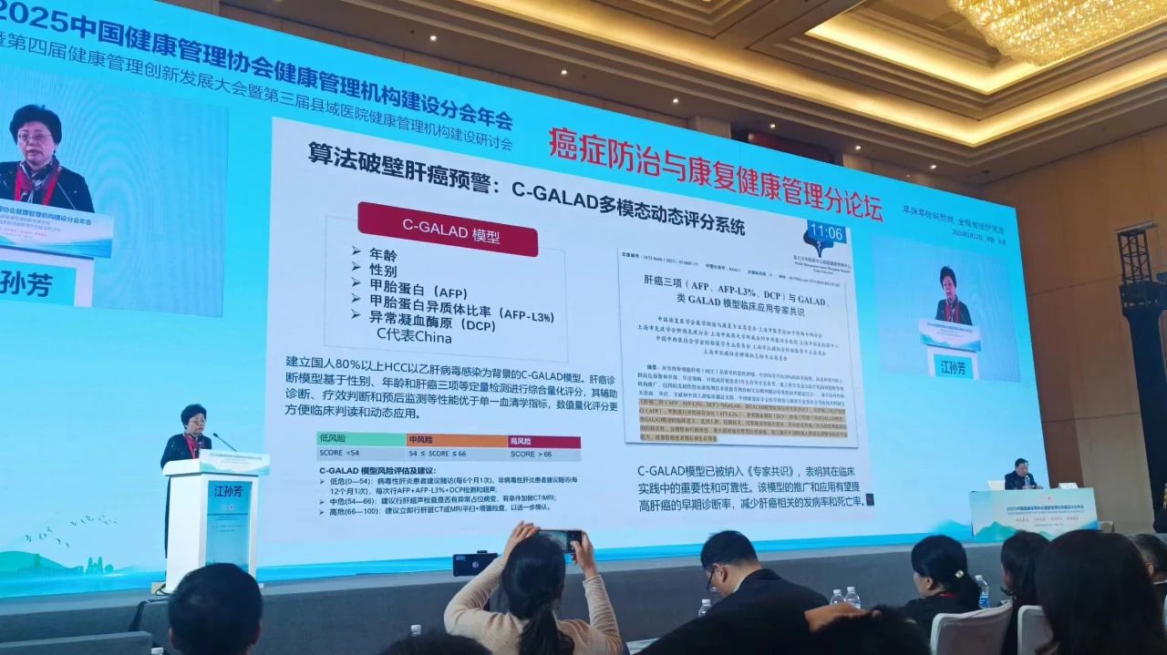 在《癌症防治与康复康健治理》专项论坛中,复旦大学隶属中山医院江孙芳主任受邀发表专题陈诉《康健治理中心-社区联动 助力肝癌早筛》,从临床实践与科研结合的角度,系统论述了C-GALAD模型在肝癌早期筛查中的创新应用价值。
